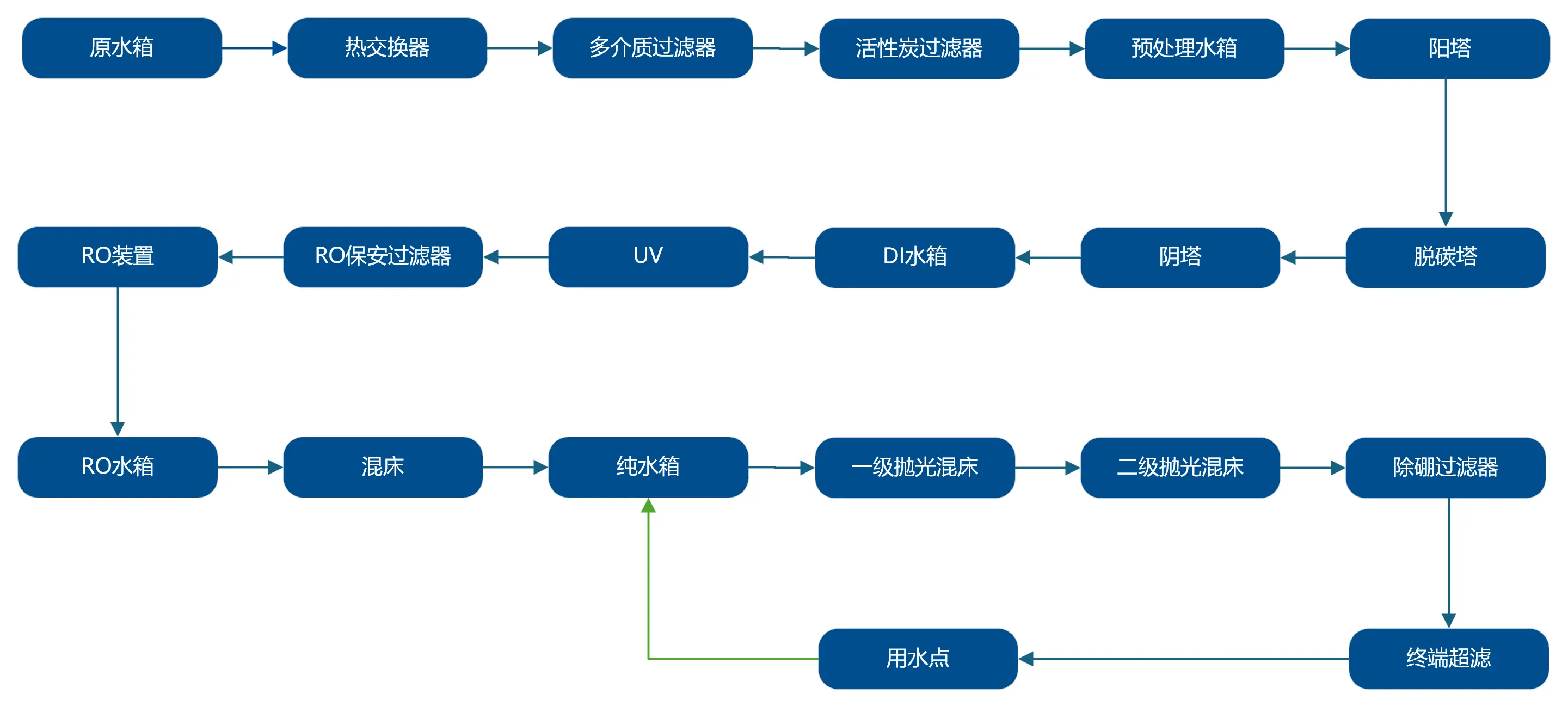 相较于全膜法(如RO+EDI工艺),2B3T工艺在半导体超纯水制备中展现出以下核心优势: